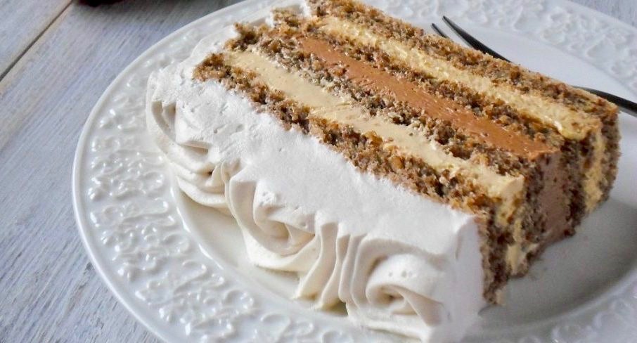 Słodki przysmak o boskim aromacie i smaku – ciasto orzechowe z kremem cappuccino, kremem kawowym i bitą śmietan